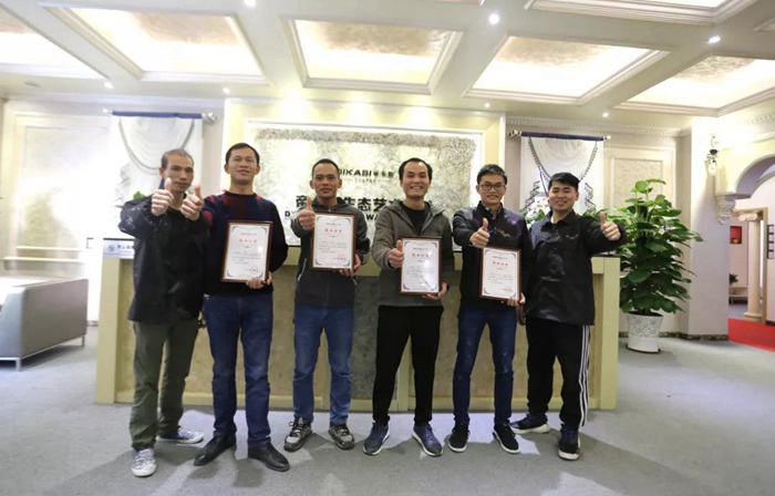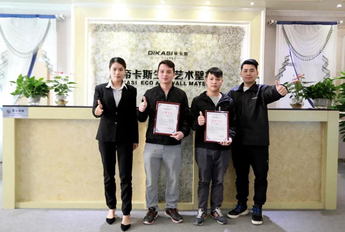 在帝卡斯生态艺术壁材总部,来自五湖四海的合作盟友学员们结束了为期七天的工艺培训。祝贺学员们顺利学成毕业! 学员合影 本次培训的课程分别由帝卡斯企业文化讲解、工程施工流程,展厅施工注意事项、技术问题百问百答、理论知识考核、墙面实操、墙面实操考核等环节组成;让学员们实地实践,深度掌握所学。 企业文化及产品理论知识讲解 理论知识考核 实操现场 墙面实操的评分标准我们主要是通过作品的美观度、工艺呈现、样品的复制性、工作环境的整洁度以及作品完成的时间等方面进行考核打分。并为通过考核的学员们颁发结业证书。 学员合影